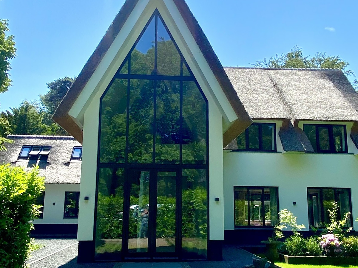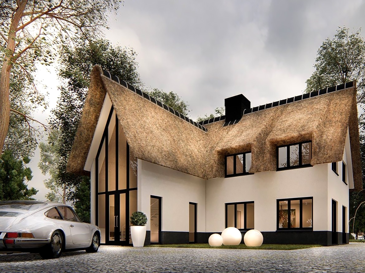 Deze luxe villa op de Zuidlaan in Aerdenhout valt op door haar bijzondere ontwerp, dat perfect in harmonie is met de omliggende natuurrijke omgeving. Het hoog rieten dak voegt niet alleen een elegante esthetiek toe, maar versterkt ook de verbinding met de natuurlijke omgeving, waardoor de villa een serene en tijdloze uitstraling krijgt.