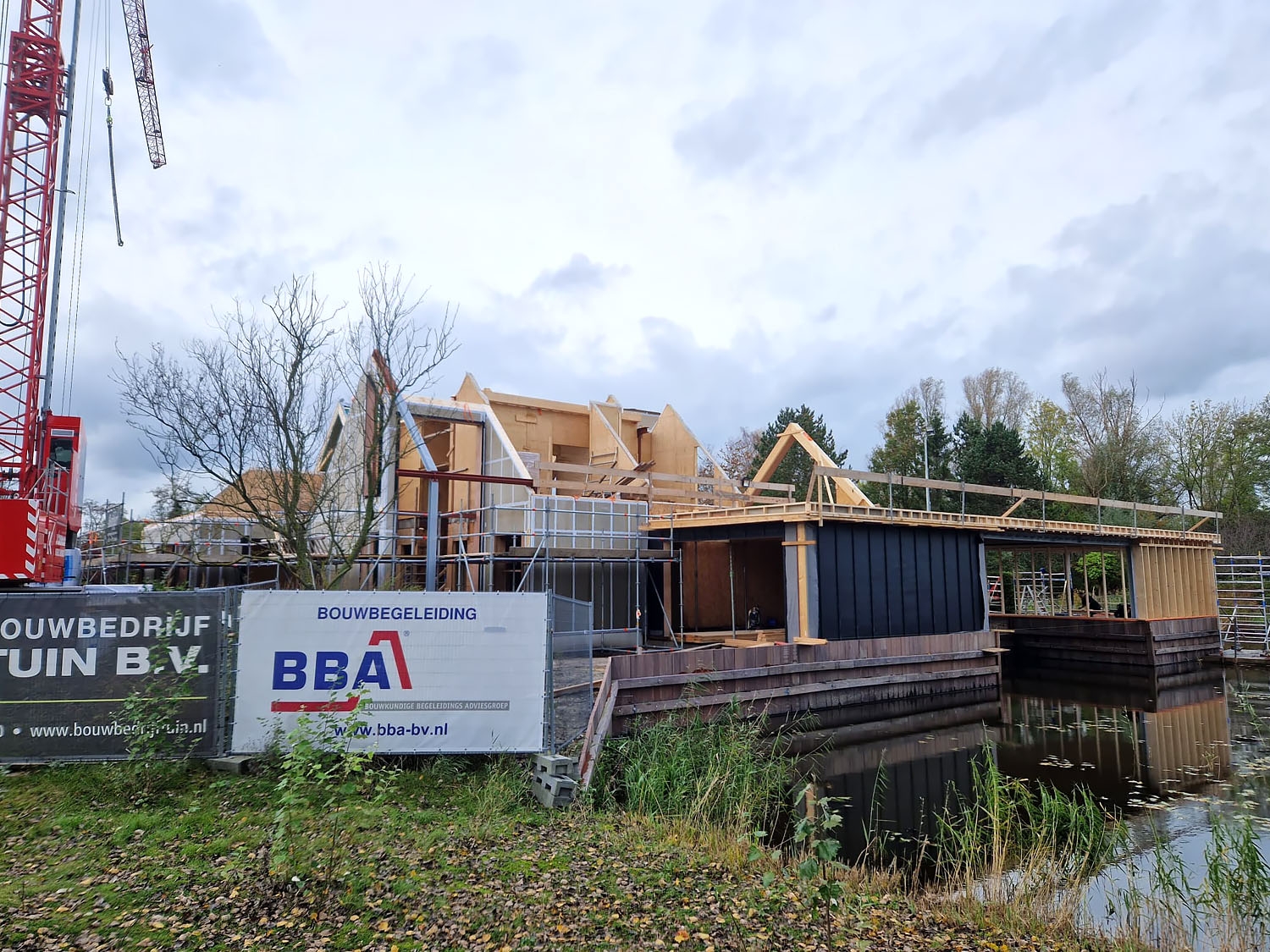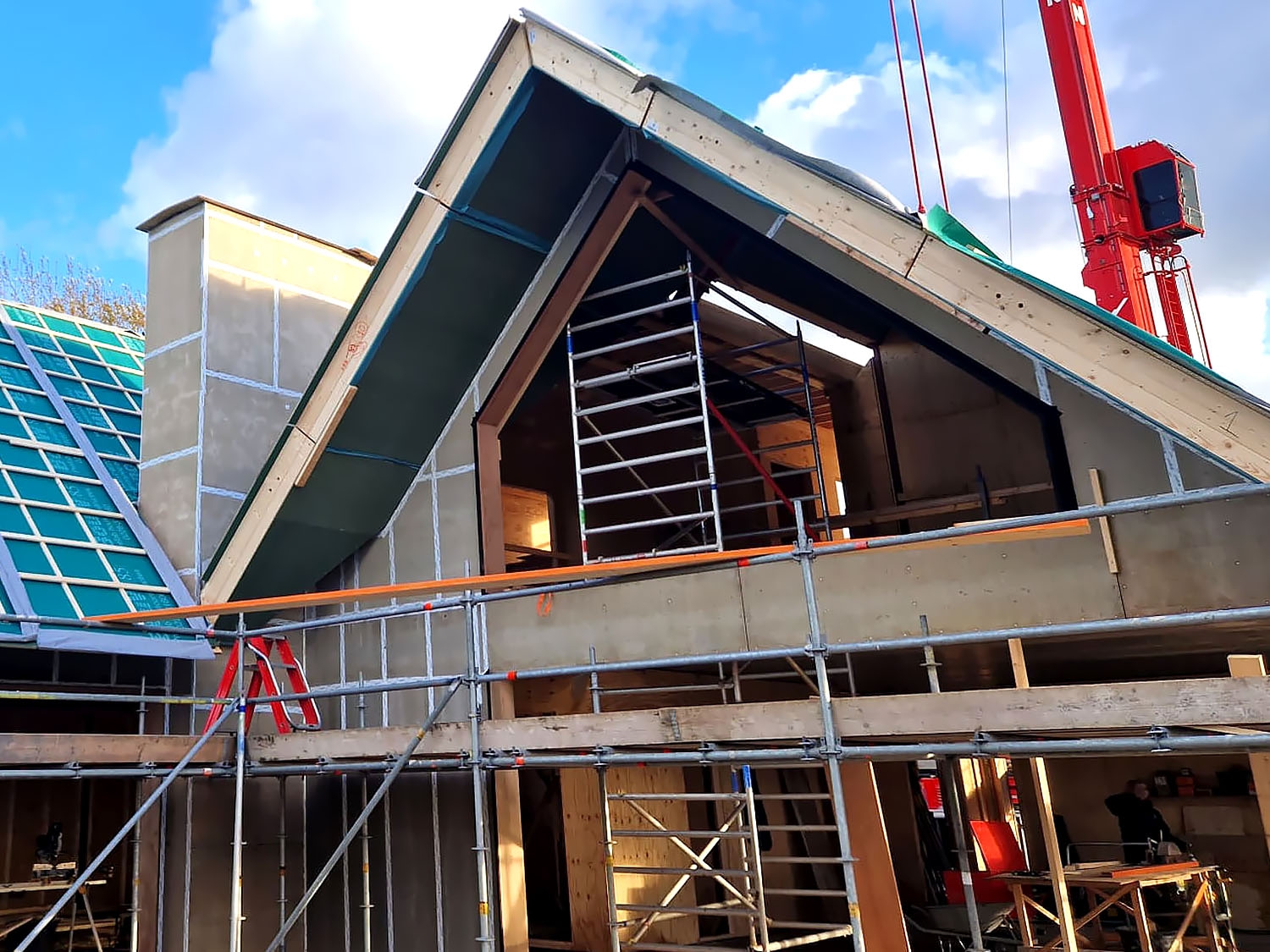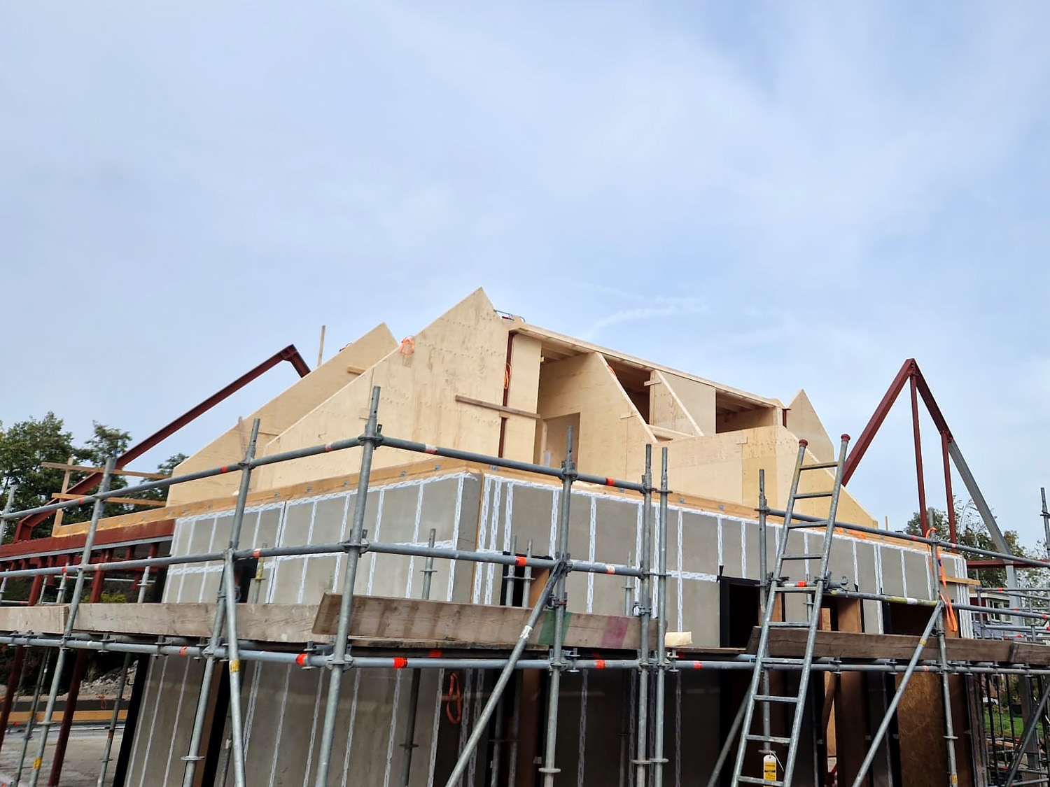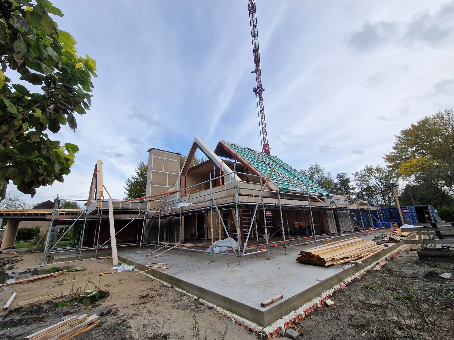 Dit project kenmerkt zich door een innovatieve hybride tafelconstructie, waarin stalen kolommen en een betonnen verdiepingsvloer worden gecombineerd met houtskeletbouw voor de rest van het gebouw. De kapconstructie, gevelelementen, platdak, binnenwanden en knieschotten zijn zorgvuldig geïntegreerd, wat resulteert in een unieke constructie met een uitzonderlijke pasvorm.